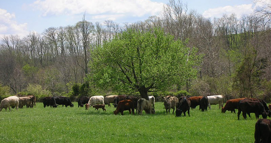 Photo of cow herd under trees and pigs in the pasture from Joel Salatin’s Polyface Farm in Swoope, Virginia:  Website  |  Facebook